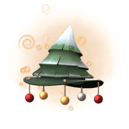 This cosmetic features a stylized evergreen tree hat with layered, snow-dusted branches. Four colorful ornaments—two red, one gold, and one silver—dangle from the brim, adding a festive touch. The design sits neatly atop the head, making it a whimsical addition to the Sniper’s look.