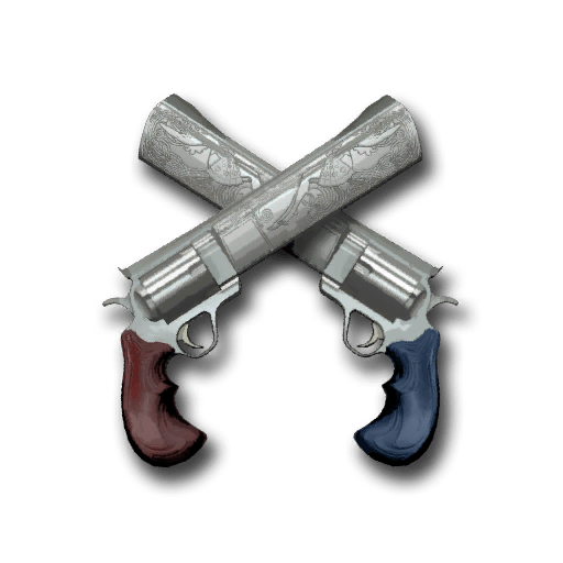 The Dueling Mini-Game features a pair of crossed revolvers, each with a distinct, ornate engraving on the barrels. One revolver has a red grip, while the other sports a blue grip, symbolizing the opposing teams. The silver finish and detailed engravings give the item a polished and elegant appearance.