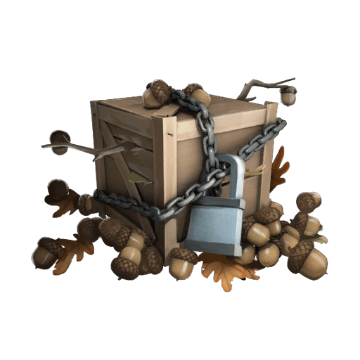 This crate is a wooden box adorned with scattered acorns and autumn leaves, evoking a fall theme. It is secured with a heavy chain and padlock, indicating that it requires a key to open. The rustic appearance and seasonal decorations make it visually distinct.