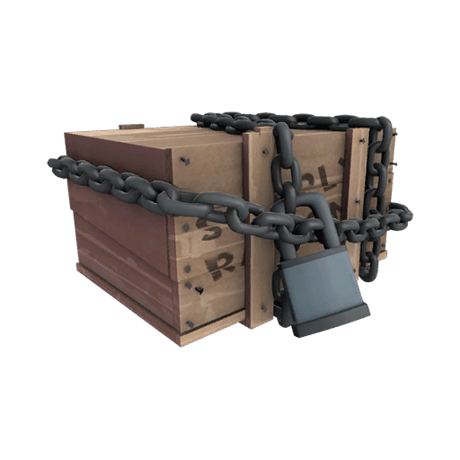 This supply crate is a sturdy wooden box secured with thick metal chains and a heavy-duty padlock. The wood has a rugged, worn appearance, suggesting it has been through some tough conditions. The chains wrap tightly around the crate, ensuring its contents are kept safe and secure.