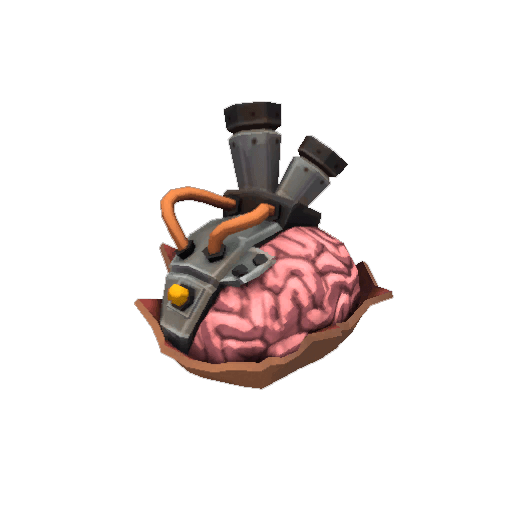 This cosmetic is a brain-themed hat featuring a detailed, exposed brain with mechanical components attached, including metal pipes and wiring. The design sits atop the Engineer's head, blending organic and industrial elements. Its unique appearance gives a distinctly inventive and quirky look.