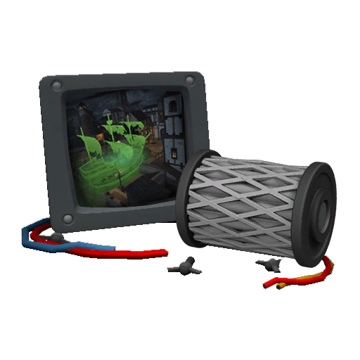 This Strange Filter is designed for use on the Cursed Cove map, adding a unique tracking element to your gameplay. The tool features a screen display with an eerie, ghostly ship scene, surrounded by colorful wires and a filter component. Its design reflects the spooky atmosphere of the map it enhances.
