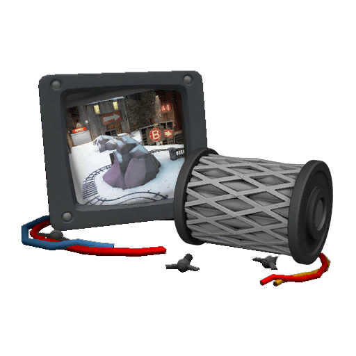 This tool features a unique design with a screen displaying a snowy scene, complete with a train track and a building. The monitor is connected with colorful wires, adding a technical touch. Accompanied by a cylindrical filter, it gives a mechanical and industrial feel.