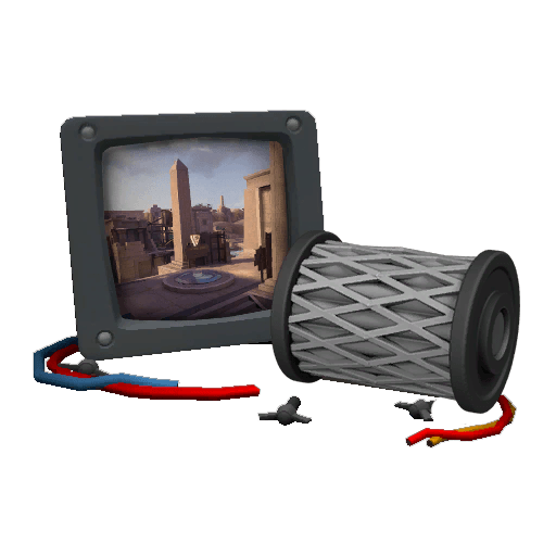 This tool features a distinctive design with a digital screen displaying the Lakeside map, accompanied by a filter component. The screen is framed in a dark casing with vibrant red and blue wires extending from it, adding a technical aesthetic. The filter has a cylindrical shape with a diamond-patterned mesh, contributing to its industrial look.