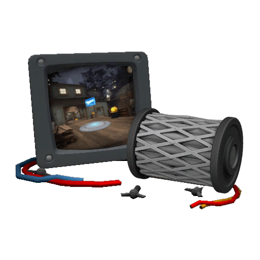 This tool features a digital display showcasing a scene from the Moldergrove map, surrounded by a rugged frame. Accompanied by a cylindrical filter with a diamond-patterned mesh, it includes loose wires and bolts, adding to its industrial aesthetic. Perfect for tracking performance in community settings.