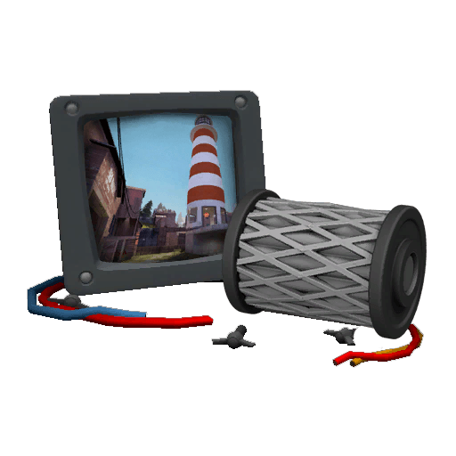 This Strange Filter is designed for tracking statistics on the Sunshine map. It features a distinctive image of a lighthouse, set within a square frame, and is accompanied by colorful wires and a cylindrical filter. Ideal for players who enjoy customizing their gameplay experience.