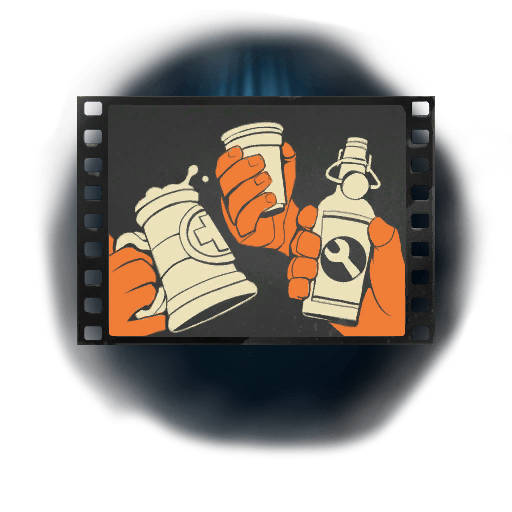 This taunt features a stylized film strip with three hands raising different drinks in a celebratory toast. Each hand holds a unique beverage container, including a stein, a bottle, and a mug, each marked with class-specific symbols.