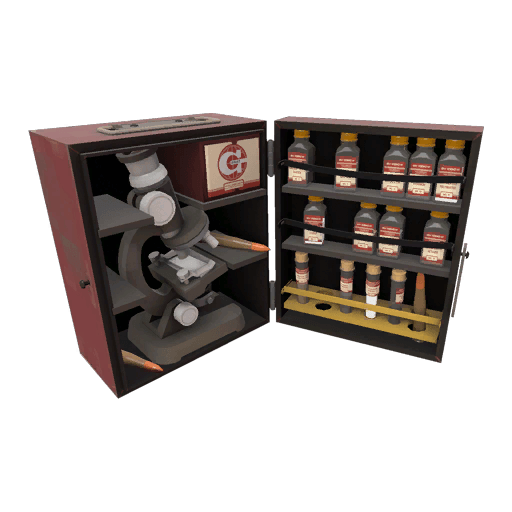 This tool features a detailed chemistry set housed in a sturdy, dark-colored cabinet. Inside, you'll find a vintage-style microscope alongside several shelves stocked with small bottles, each neatly arranged. The set exudes a classic laboratory aesthetic, perfect for those looking to add a scientific touch to their collection.